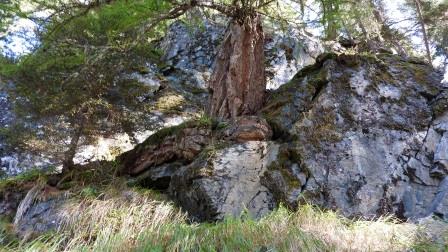 Même si les trois résineux de nos forêts s’adaptent bien aux terrains difficiles, c’est le Pin d’arole (Pinus cembra) qui prospère dans les milieux les plus improbables. Ses graines comestibles ressemblent à de petites noisettes, les montagnards en sont friands, comme les écureuils (Sciurus vulgaris) et les Casse-noix mouchetés (Nucifraga caryocatactes). Ces animaux constituent des réserves pour l’hiver, de préférence dans des cachettes difficiles d’accès et rapidement dégarnies de neige. Ils utilisent également les fissures des pierres comme étaux pour coincer les cônes qu’ils décortiquent.