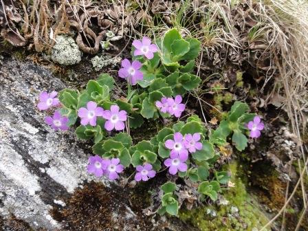 Au printemps, la spectaculaire floraison de la Primevère hérissée (Primula hirsuta) dévoile les places qu’elle occupe discrètement le reste de l’année. On ne la reconnaît alors qu’aux feuilles collantes qui garnissent les fissures des rochers. Les racines de la Réglisse sauvage (Polypodium vulgare) s’immiscent également dans les petites anfractuosités. On préfère la cueillir quand elle pousse dans une mousse abondante, où ses rhizomes consommables se développent mieux.
