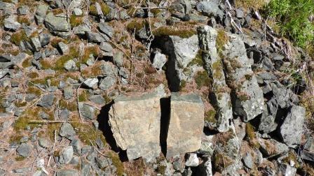 Les racines traçantes des conifères stabilisent le terrain en l’enserrant dans une cotte de mailles de bois. Les troncs arrêtent ou ralentissent les pierres qui parviennent à s’échapper. Dans une moindre mesure, l’action des racines combinée au gel-dégel disloque les rochers. On distingue des zones plus claires, des roches récemment dégagées, et des pierriers au pied des parois.